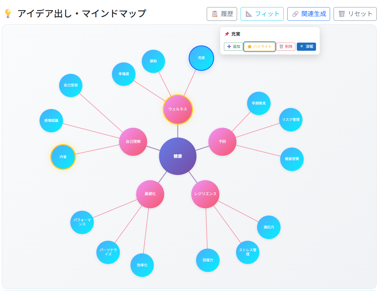 末端ノード(関連ワード)の生成を AI に行わせる機能もありますが、ここは人間が手動でやったほうが良いのか AI の自動生成でもアイデア出しの刺激になるのか、このあたりは使ってみないとわかりませんね。