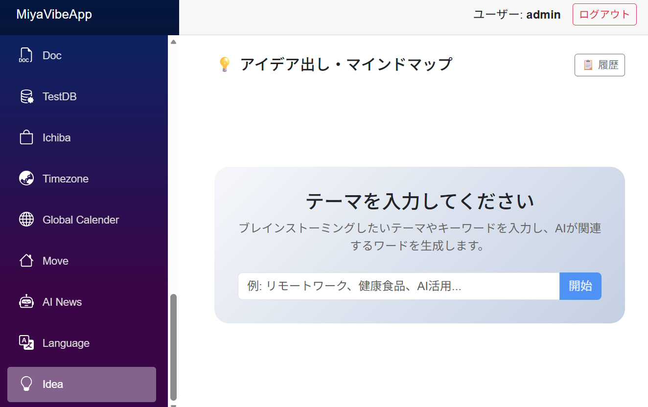 | テーマから関連ワード生成 | ユーザーが入力したテーマをプロンプトに埋め込み、関連する単語5個をJSON形式で生成させる | 「{theme}」に関連する単語やキーワードを5個生成してください → {“words”:[“…”, …]} |
