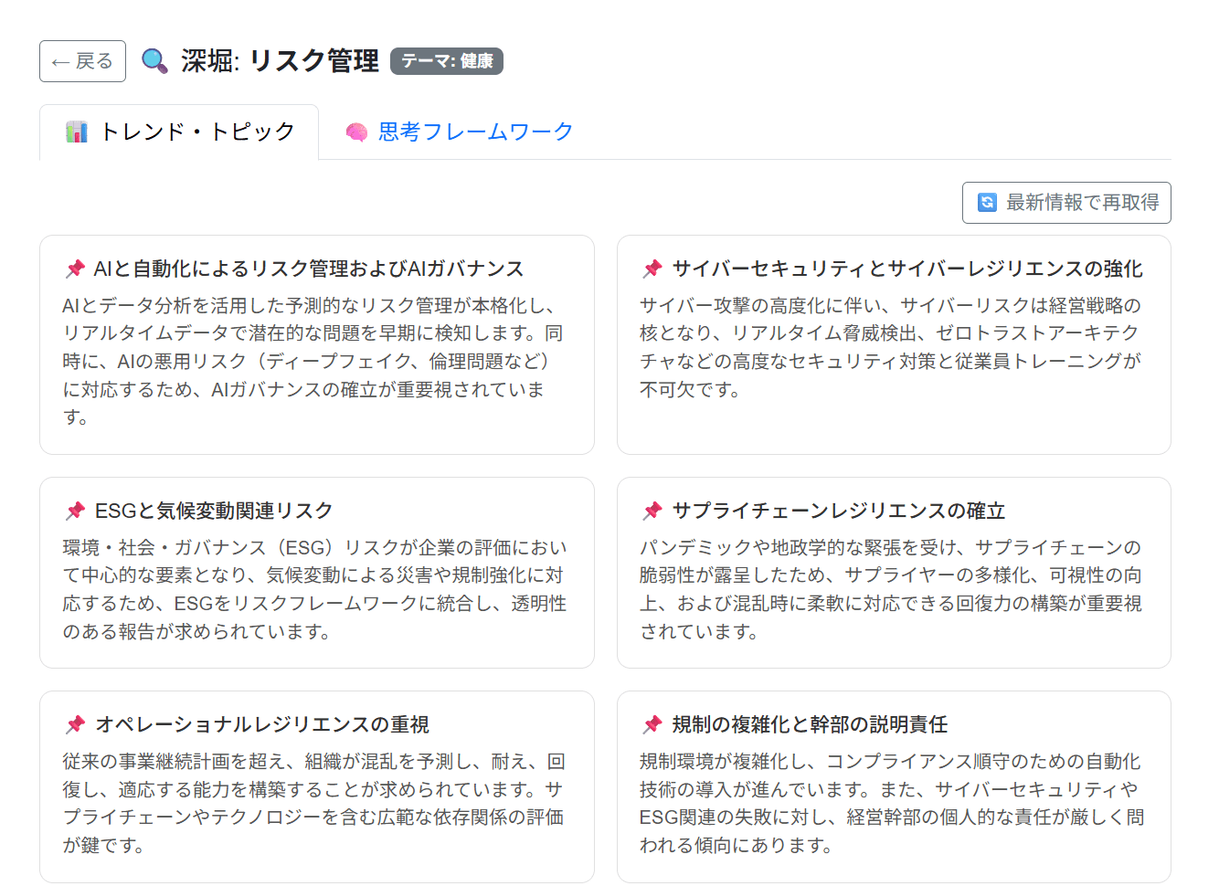 深堀を選択すると、そのワードに関して AI がトレンドやトピックをいくつか示してくれます。あくまでも参考情報程度ですがアイデア出しの助けに少しくらいなるでしょう。