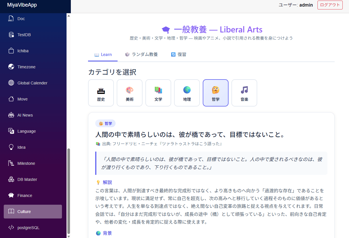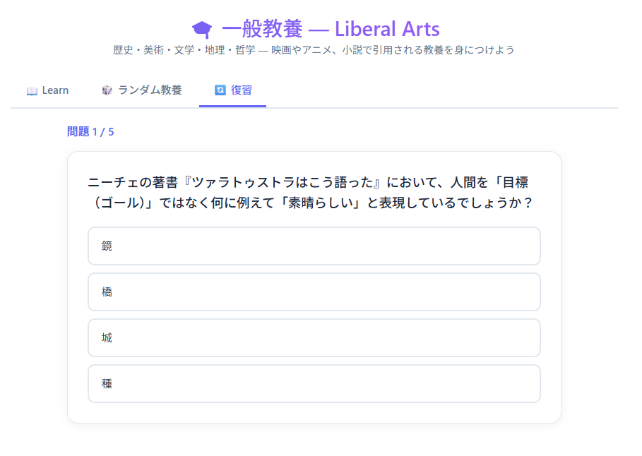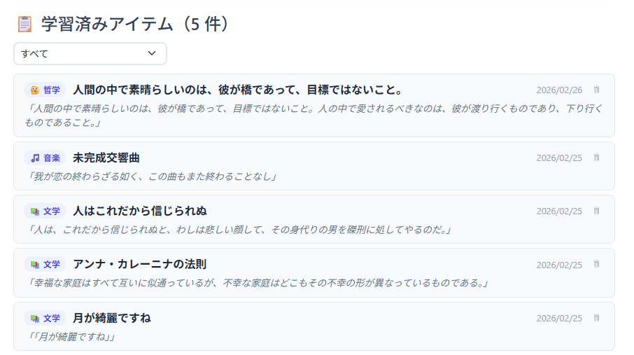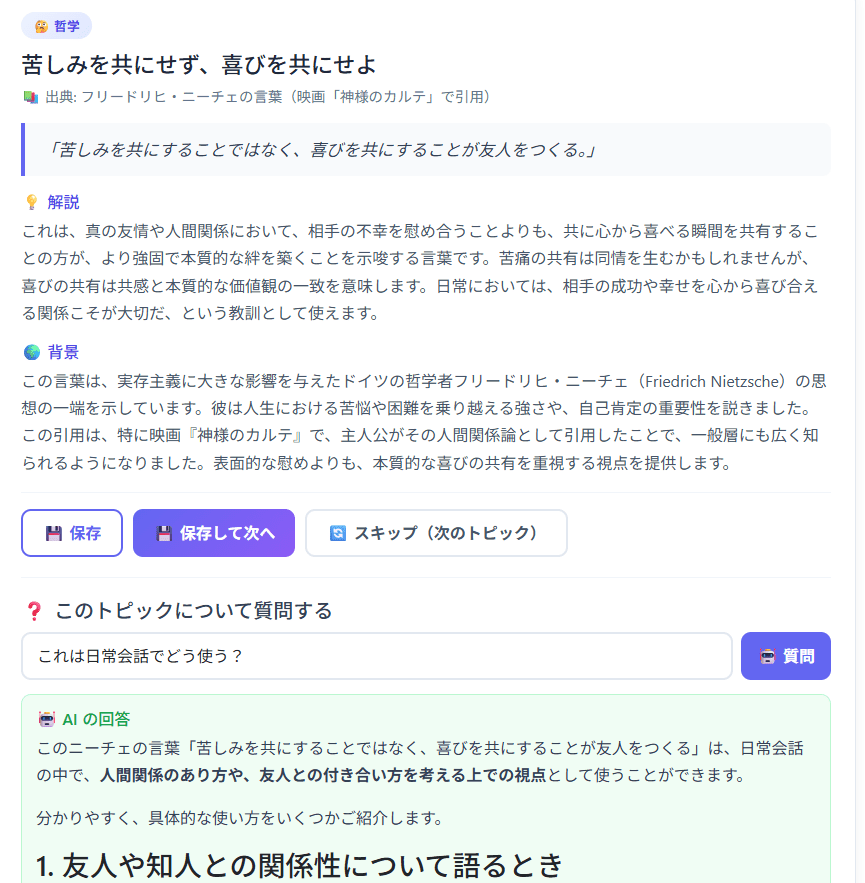 保存した教養データはデータベースに保存してあるので復習として AI がクイズを出してくれます。