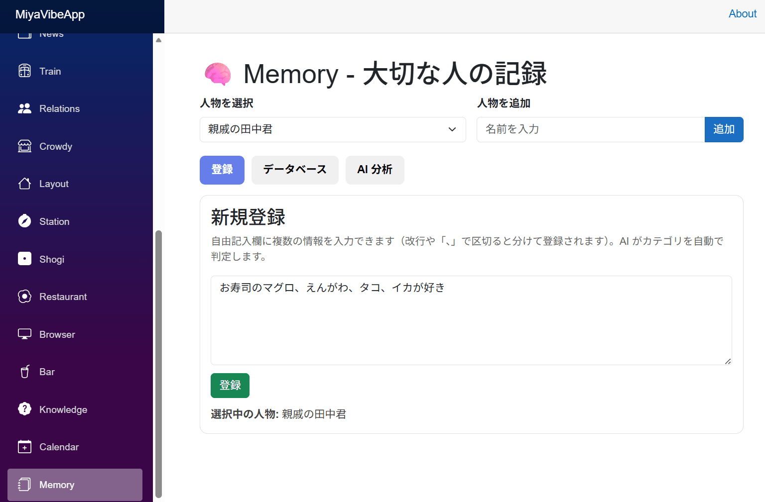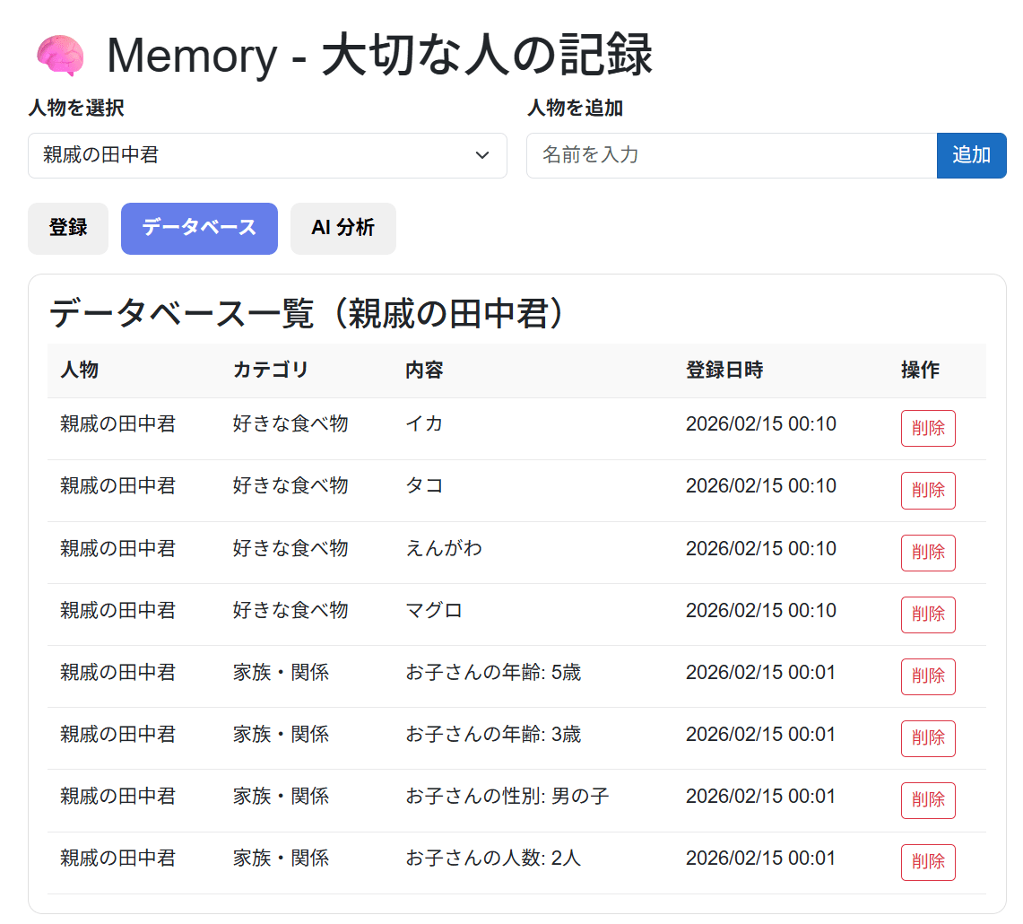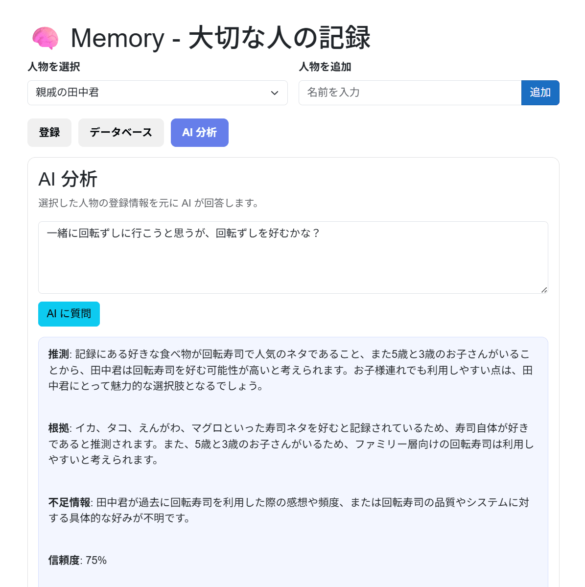 友人や家族等の、その人の好みや周辺情報をデータベースに登録し、そのデータを元に AI が分析してくれます。なんちゃって RAG です(厳密にはプロンプトに結果を埋め込んでいるだけです)。