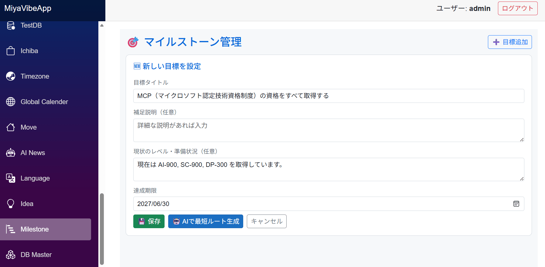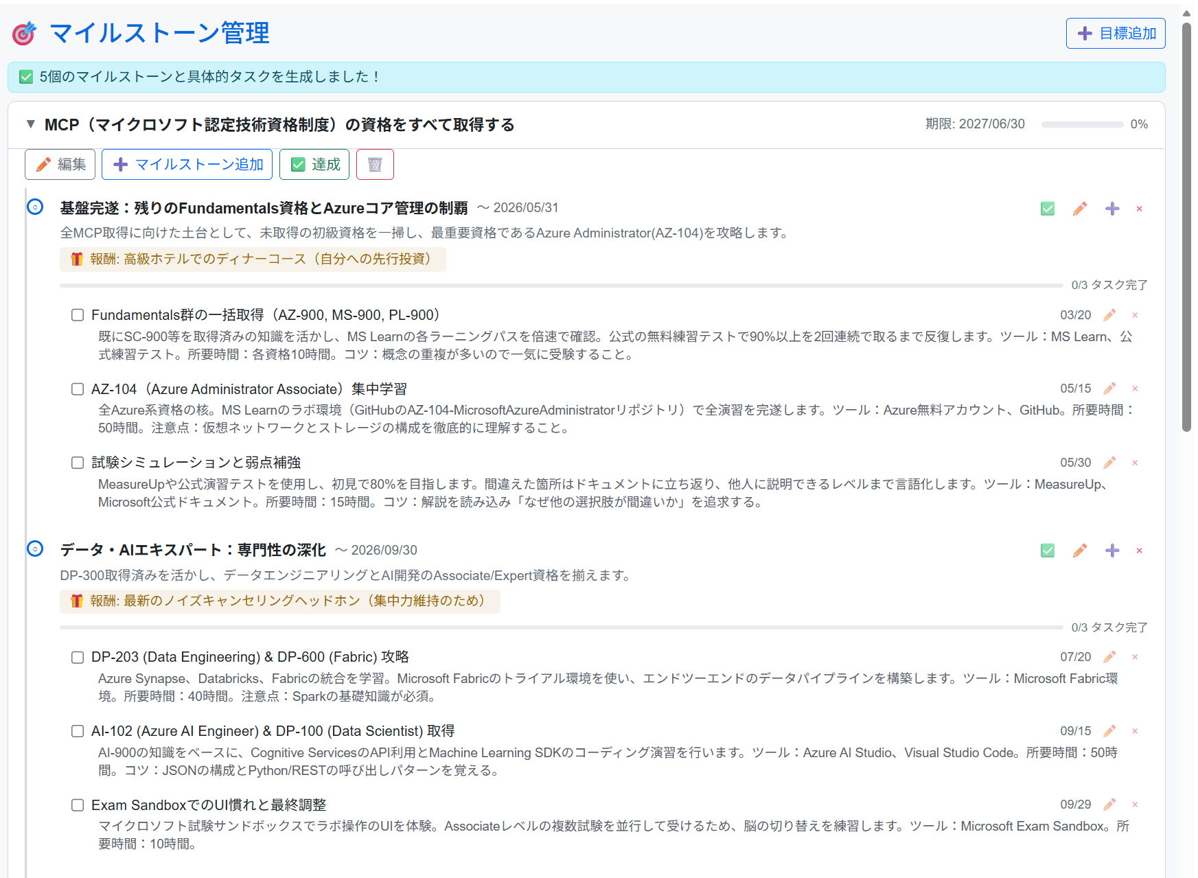 アプリとしてはシンプルで、目標や詳細をユーザーが入力し、ゴールへの進捗管理やマイルストーン設定ができます。ユーザーが手動で 1 つ 1 つマイルストーンを追加することもできますが、AI が自動で最短ルート(適当なルート)の生成を行ってくれます。