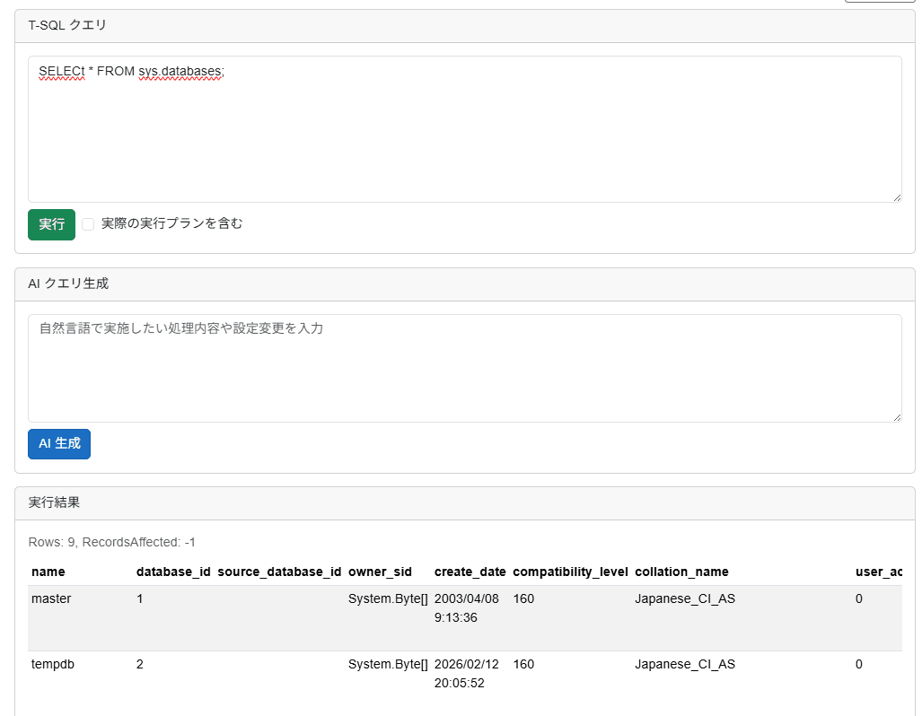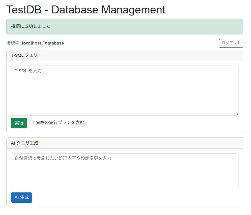 今日作成したのはデータベースへの接続やクエリテストを行える AI アプリです。