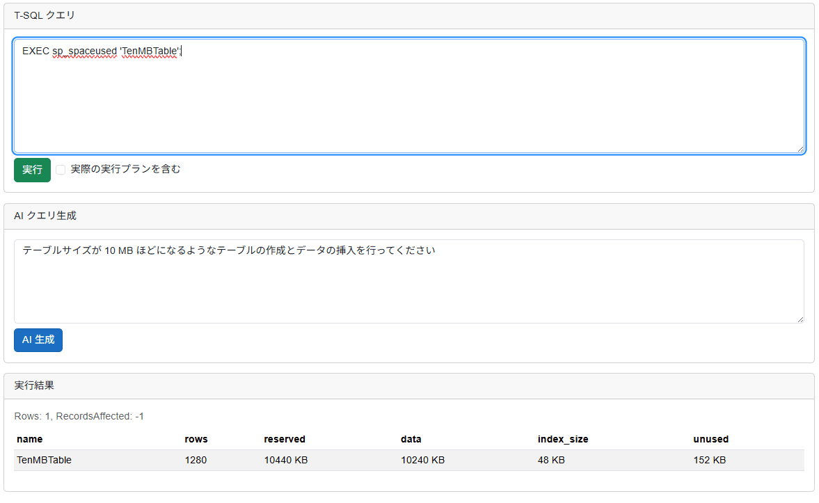 例えば、”テーブルサイズが 10 MB ほどになるようなテーブルの作成とデータの挿入を行ってください” とプロンプトを入れると、以下のようなクエリが生成されました。