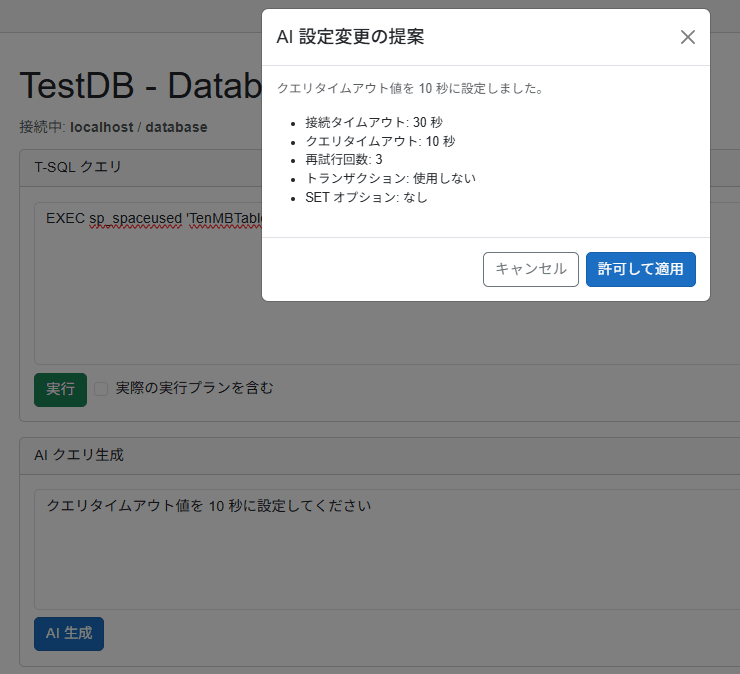 ちなみに、AI への指示は SQL クエリの生成だけでなく、データベース接続(ドライバー)の設定変更も可能です。例えば、クエリタイムアウト値の変更を AI に指示することで変更も可能です。