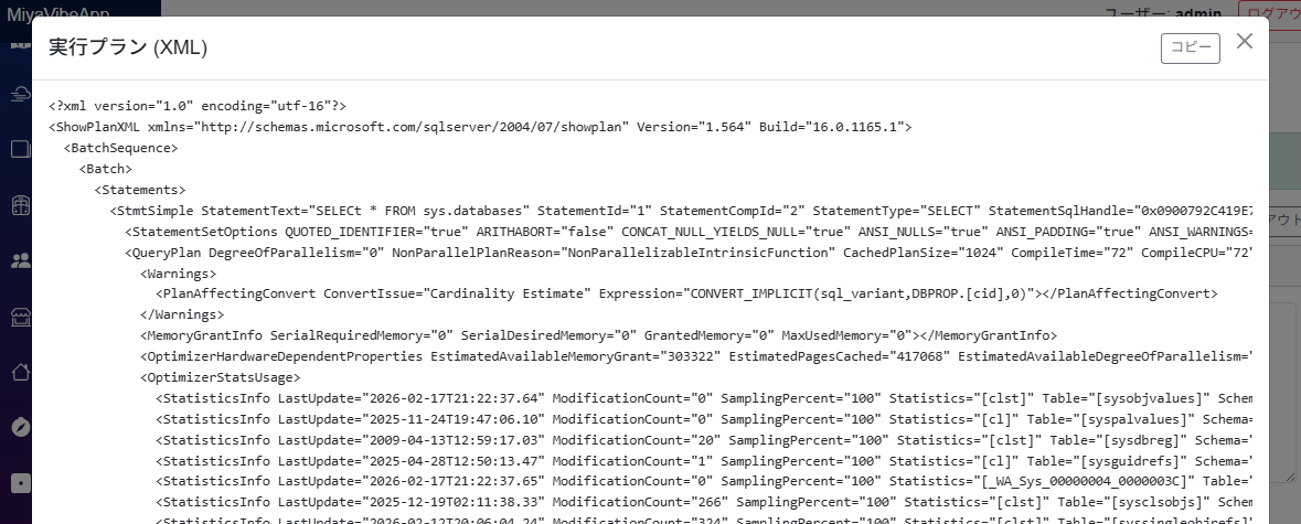 実行プランを表示というオプションを有効にしてクエリを実行すると、XML の実際の実行プラン(Actual Plan)を表示することもできます。
