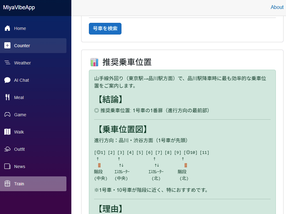 ※AI はどの号車に乗るべきかという情報はどこから学んだのだろうか、そもそもこの結果は正しいのか。。正しいかは明日以降実際に体験してこようと思います。