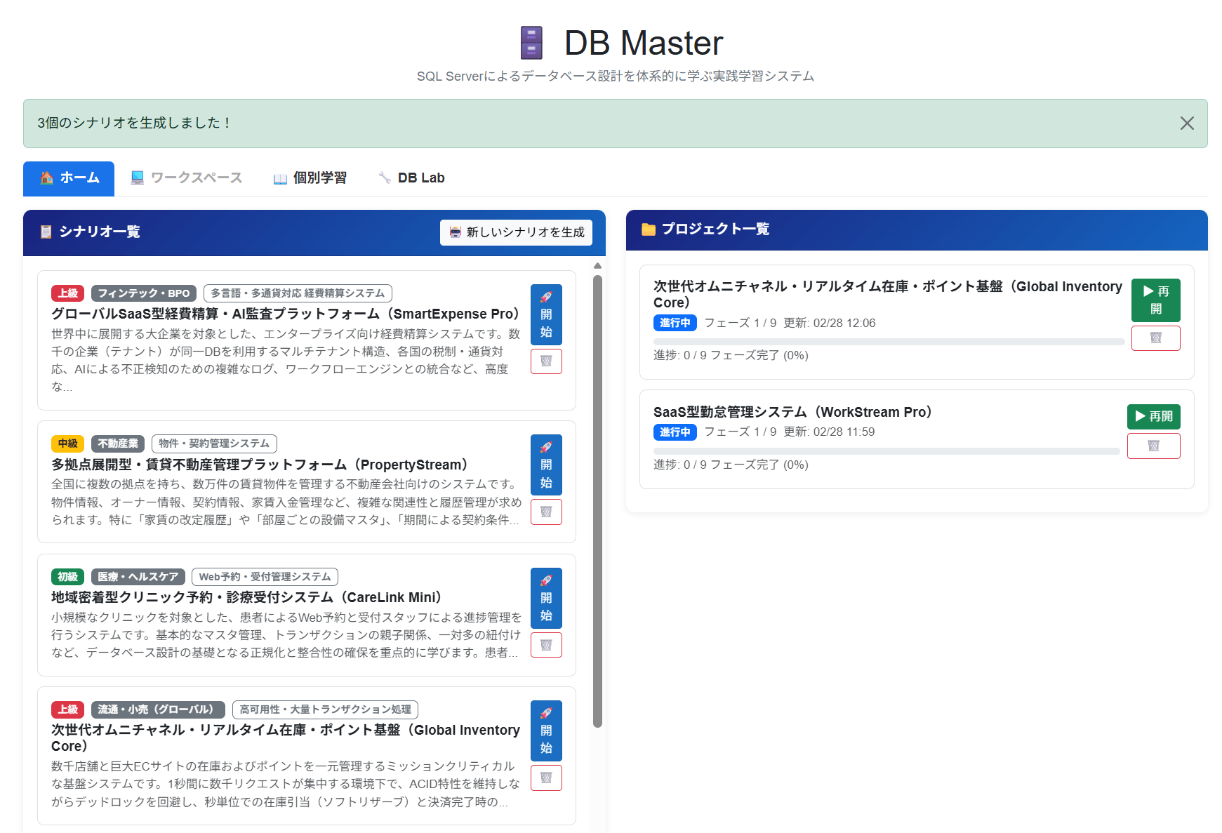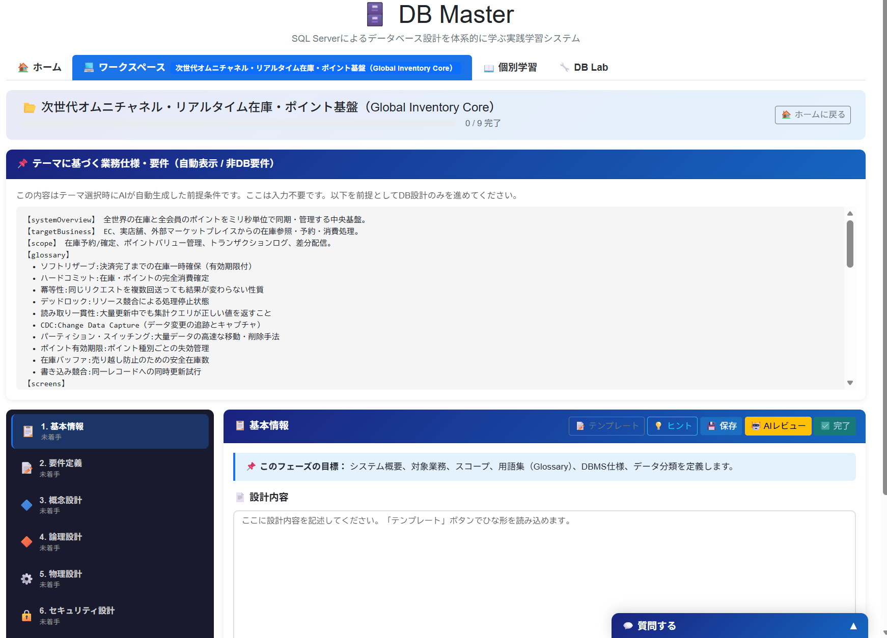 | 3 | Q&A(質問応答) | フローティングQ&Aパネルの送信 | ユーザーの質問 + 現在のフェーズ情報 + シナリオ要件 | SQL Server DB設計の専門家として、T-SQL例やベストプラクティスを含めて回答 | Markdown | そのまま表示し、質問・回答のペアを DB の テーブルに保存 |