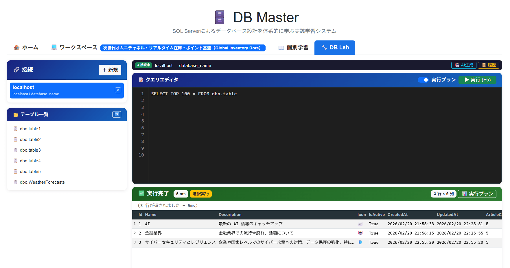 | 5 | デモデータ生成 | DB Labタブ「デモデータ生成」 | 対象テーブルのDDL + 生成件数 | 参照整合性を満たす日本語の現実的なINSERT文を生成 | SQL(INSERT文のみ) | そのままクエリエディタに反映して実行可能 |
