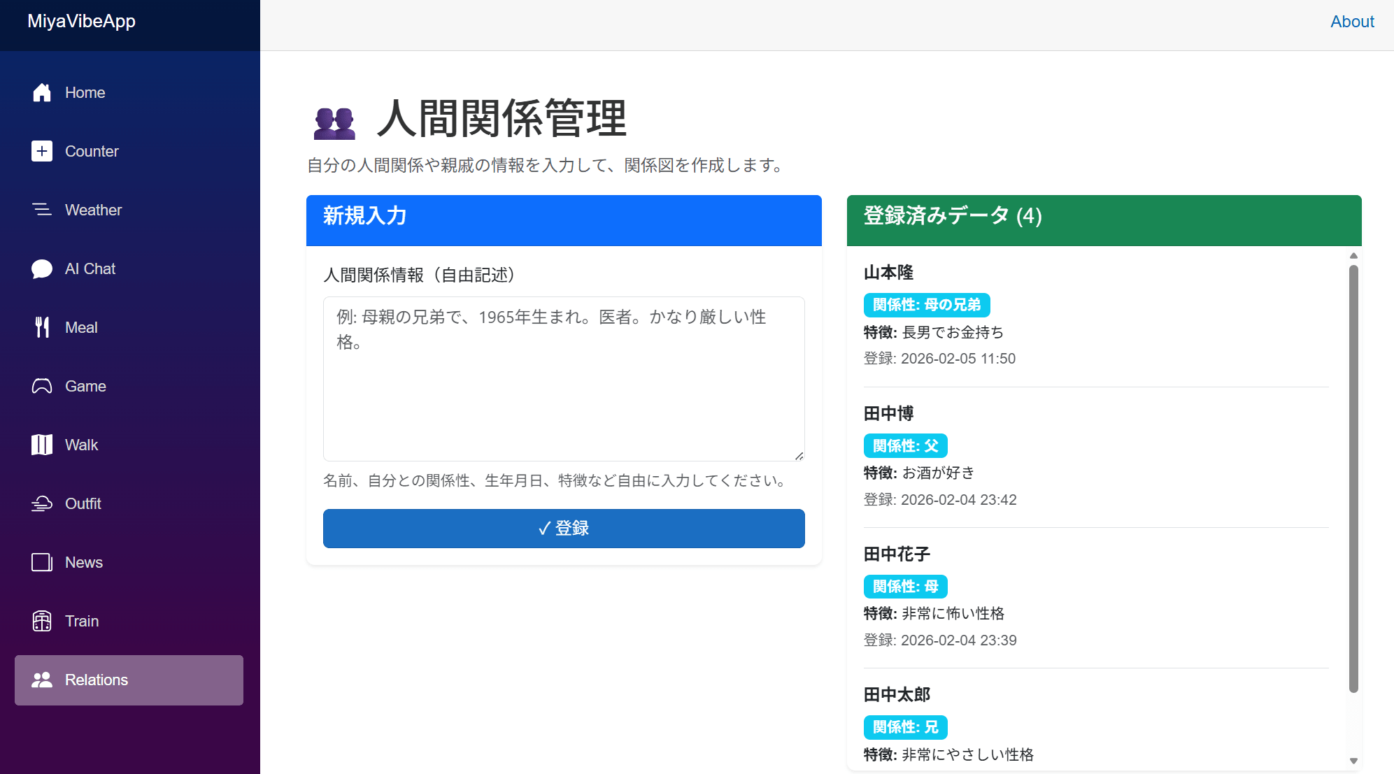 ユーザーは、登録したい人物の名前や生年月日、属性や性格など関連する情報を自由記述欄に記載します。