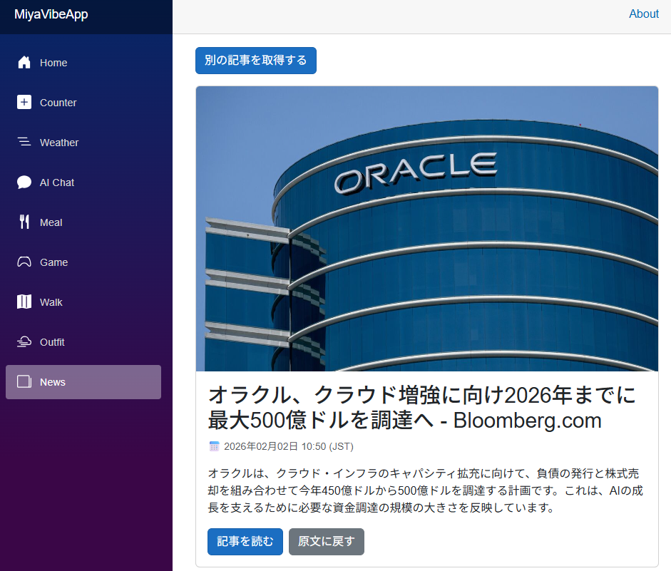 今日作成した AI アプリは、ニュース記事をランダムに取得しその冒頭を表示するアプリです。