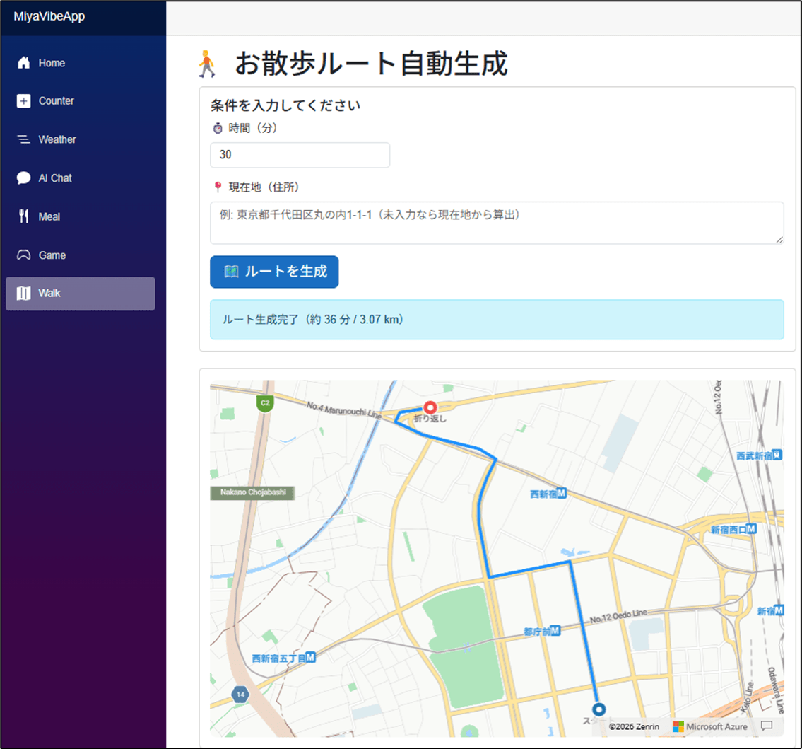 C#/Blazor からこの JavaScript コード内の各関数を呼び出し、画面描画する際に MAP 情報を呼び出し、ルート検索ボタンをクリックした際に現在の場所を取得する関数、ルート生成の呼び出しをトリガーします。コードの全容は乗せませんが、async function generateRoute(options) という一つの関数でルート取得を行っており、ここがこのアプリの肝となります。